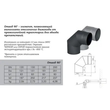 Материал изготовления - сталь марки 08ПС толщиной 2 мм, окрашенная в черный или серый цвет. Рабочая температура до 800°С. Сборка элементов между собой производится по конденсату без хомутов - через раструбное соединение, которое является плотным благодаря уникальным посадочным размерам изделий.